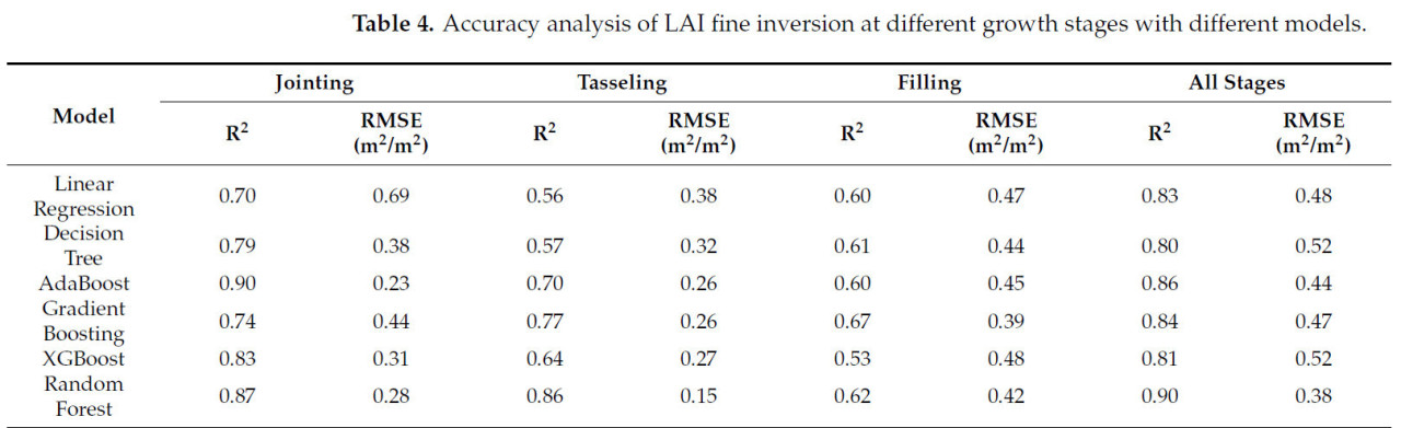 При горизонтальном сравнении точность каждой модели на стадии смыкания рядов лучше, чем на стадии выбрасывания метелок, а точность каждой модели на стадии выбрасывания метелок лучше, чем на стадии налива зерна. Однако из-за недостаточного объема выборочных данных, использованных в этом исследовании, точность каждой модели на отдельной стадии роста в целом ниже, чем при инверсионном определении LAI на протяжении всей стадии роста.