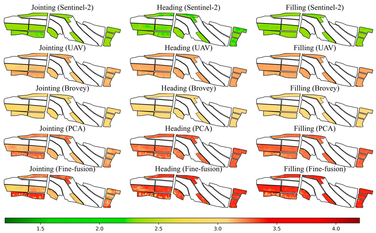В этом исследовании используются пять режимов данных: Sentinel-2, БПЛА, Brovey [56], PCA [57] и Fine-fusion. На основе оптимальной комбинации признаков, установленном окне выборки признаков 3×3 и оптимальных гиперпараметрах модели, используется алгоритм Random Forest для инверсионного определения индекса площади листовой поверхности (LAI) на разных стадиях роста. Пространственное распределение LAI на разных стадиях роста при разных режимах данных показано на Рисунке 9. Результаты инверсии показывают, что значения LAI на каждой стадии роста в целом ниже 4,3, что соответствует распределению полевых выборочных данных. При каждом режиме данных с развитием стадии роста значение LAI демонстрирует общую тенденцию к увеличению, что соответствует фактической ситуации роста кукурузы в районе исследования. Распределение LAI, инверсированное с помощью предложенного в этой статье метода слияния данных (Fine-fusion), имеет более выраженную неоднородность и может различать различия в распределении LAI в разные периоды сева. Например, на стадии смыкания рядов рост зоны, засаженной фермером, и зоны первого сева значительно лучше, чем зоны второго сева, а рост зоны второго сева лучше, чем зоны третьего сева (в это время зона второго сева вступила в раннюю стадию выбрасывания метелок), в то время как различия в росте в разные периоды сева при других режимах данных почти неразличимы.