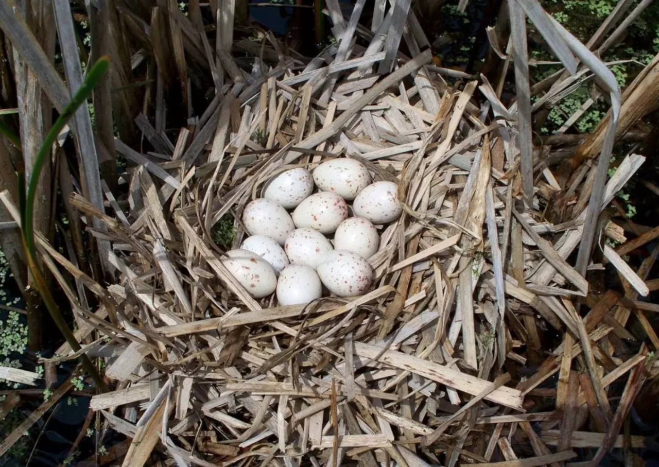 Гнездо погоныша (Porzana carolina) на мелководном болоте в районе управления водно-болотными угодьями Моррис в Миннесоте. Погоныши — маленькие болотные птицы. Обычно они откладывают от 10 до 12 яиц в одной кладке, но иногда могут отложить до 18.