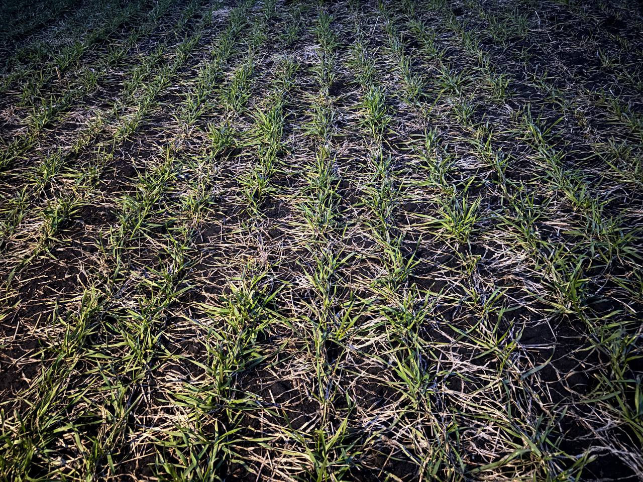 По факту не все так плохо: видно, что хуже выглядят края, наверное, там, где было больше снега. Сев был с 8 по 20 сентября - погода, как понимаете, диктовала свои условия. Предшественник тоже влияет: там, где два года назад была соя, посевы выглядят интереснее. Опытные участки тоже живы - они тоже на фото.