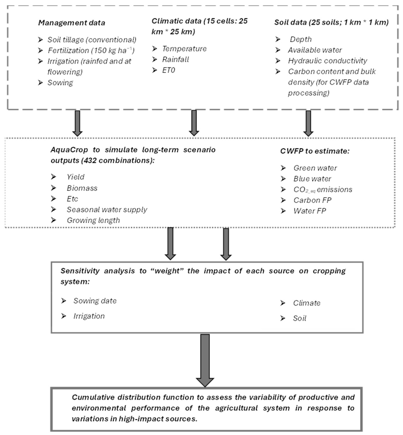 Экологическая эффективность сельскохозяйственной системы была формализована с использованием инструмента Carbon and Water Footprint [63]. Этот инструмент количественно определяет выбросы парниковых газов (выраженные как CO₂-экв.) и использование воды (голубая и зеленая составляющие) при возделывании твердой пшеницы в средиземноморской среде. Разработка CWFP следует основным этапам LCA, включая определение объема, целей, границ системы, потоков входных материалов, распределения воздействия, функциональной единицы и экологического следа. Дизайн инструмента ориентирован на доступность для пользователя, имеет интуитивно понятный интерфейс, который интегрирует ключевые практики управления почвой и культурами. Для каждой выбранной опции CWFP рассчитывает воздействие на окружающую среду, используя процессы, реализованные в SimaPro (версия 8). Инструмент использует анализ «от колыбели до ворот» (cradle-to-gate), который ограничивает систему границами фермы и требует данных от посева до уборки урожая, учитывая воздействие от добычи сырья, производства агроресурсов и их внесения в поле. Материальные и энергетические потоки включают различные машины, оборудование, удобрения и пестициды, актуальные для систем возделывания твердой пшеницы в средиземноморском контексте.