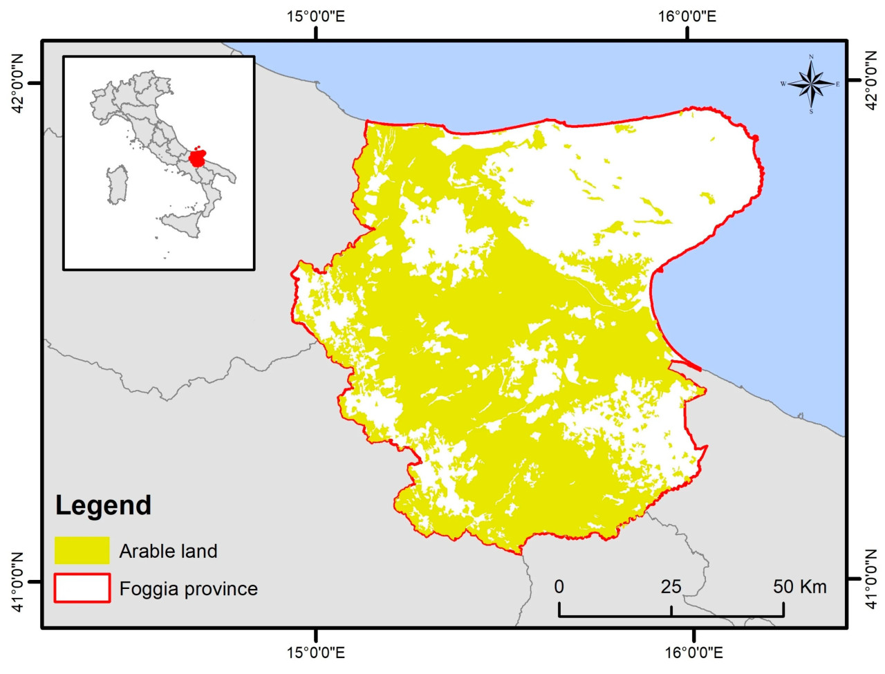 Сценарии моделирования основывались на реальных практиках, используемых фермерами в провинции Фоджа, также известной как Капитаната, в регионе Апулия (41°27′ с.ш., 15°33′ в.д., 76 м над уровнем моря: Рисунок 2). Этот район является ведущим производителем твердой пшеницы в Италии, на его долю приходится 38% от общей площади пахотных земель, выделенных под эту культуру [51]. Площадь пахотных земель представлена на Рисунке 2 в соответствии с базой данных регионального землепользования [52]. Твердая пшеница выращивается в системах непрерывного возделывания, с посевом, обычно происходящим в период с середины октября по середину ноября.
