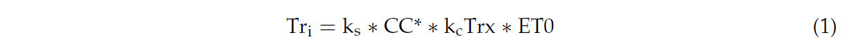где kₛ обозначает коэффициент стресса почвенной влаги, kcTrₓ представляет коэффициент для максимальной транспирации культуры, а CC относится к фактическому зеленому покрытию полога, скорректированному с учетом микроадвективных эффектов.