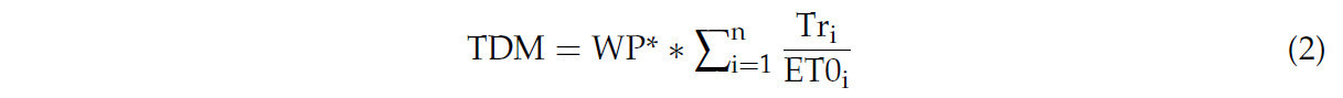 Суточная надземная биомасса (TDM, т га⁻¹) рассчитывается с использованием Trᵢ и продуктивности воды, нормализованной по ET0ᵢ (WP, г/м²; [59]) следующим образом: