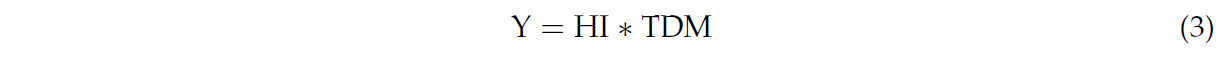 Наконец, урожайность сухого зерна (Y, т га⁻¹) оценивается при созревании на основе TDM и индекса сбора урожая (HI, %) в соответствии со следующим уравнением: