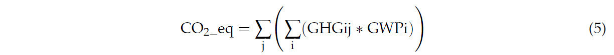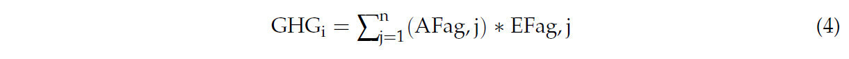 где GHGᵢⱼ представляет количество газа типа i во время операции j, GWPᵢ — потенциал глобального потепления газа i, ∑ᵢ учитывает выбросы ПГ во время конкретной операции, а ∑ⱼ суммирует выбросы ПГ через все операции управления, выполняемые через сельскохозяйственную систему.