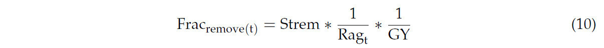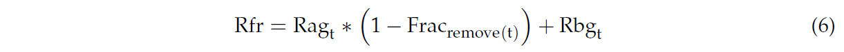 где Rfr (кг га⁻¹) — растительные остатки, возвращенные в почву, Rаг_t — отношение сухой массы надземных остатков (кг га⁻¹), Frac_remove(t) — доля растительных остатков, удаленных с почвы, а Rбг_t — отношение подземных остатков к убранному урожаю (кг га⁻¹). Rаг_t определяется следующим образом: