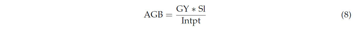 где AGB — надземная сухая биомасса (кг га⁻¹), а GY — урожайность (кг га⁻¹). AGB (кг га⁻¹) рассчитывается следующим образом: