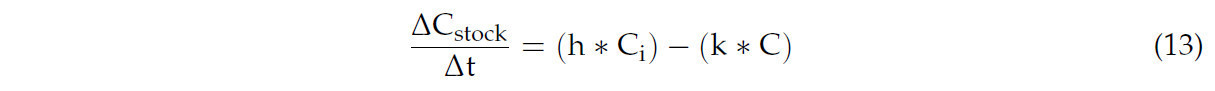 где (ΔC_s) / Δt — годовое изменение запаса углерода в момент времени t, а h и k — коэффициенты деградации для углерода, предоставленного соломой (43% от общей сухой массы), и для почвенного органического углерода соответственно. Запас почвенного углерода в момент t0 рассчитывается путем умножения исходного содержания органического вещества почвы (%; при отсутствии точного числового значения пользователь может указать уровень органического вещества почвы, например, бедный, среднеобеспеченный или хороший) на процент углерода в органическом веществе (58%) и на объемную плотность (кг м⁻³) — значение, предоставляемое пользователем или путем указания, является ли почва песчаной, глинистой или суглинистой.