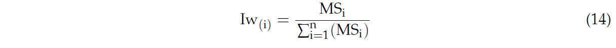 где MS представляет средний квадрат, связанный с конкретным источником вариации (i), а ∑(MSᵢ) от i=1 до n обозначает сумму всех средних квадратов, полученных в результате ANOVA для оцениваемых различных параметров. Источники вариации включали климатические зоны, типы почв, сроки посева и режимы орошения, в то время как анализируемыми параметрами были урожайность зерна, CO₂-экв., CFP, TW и WFP.