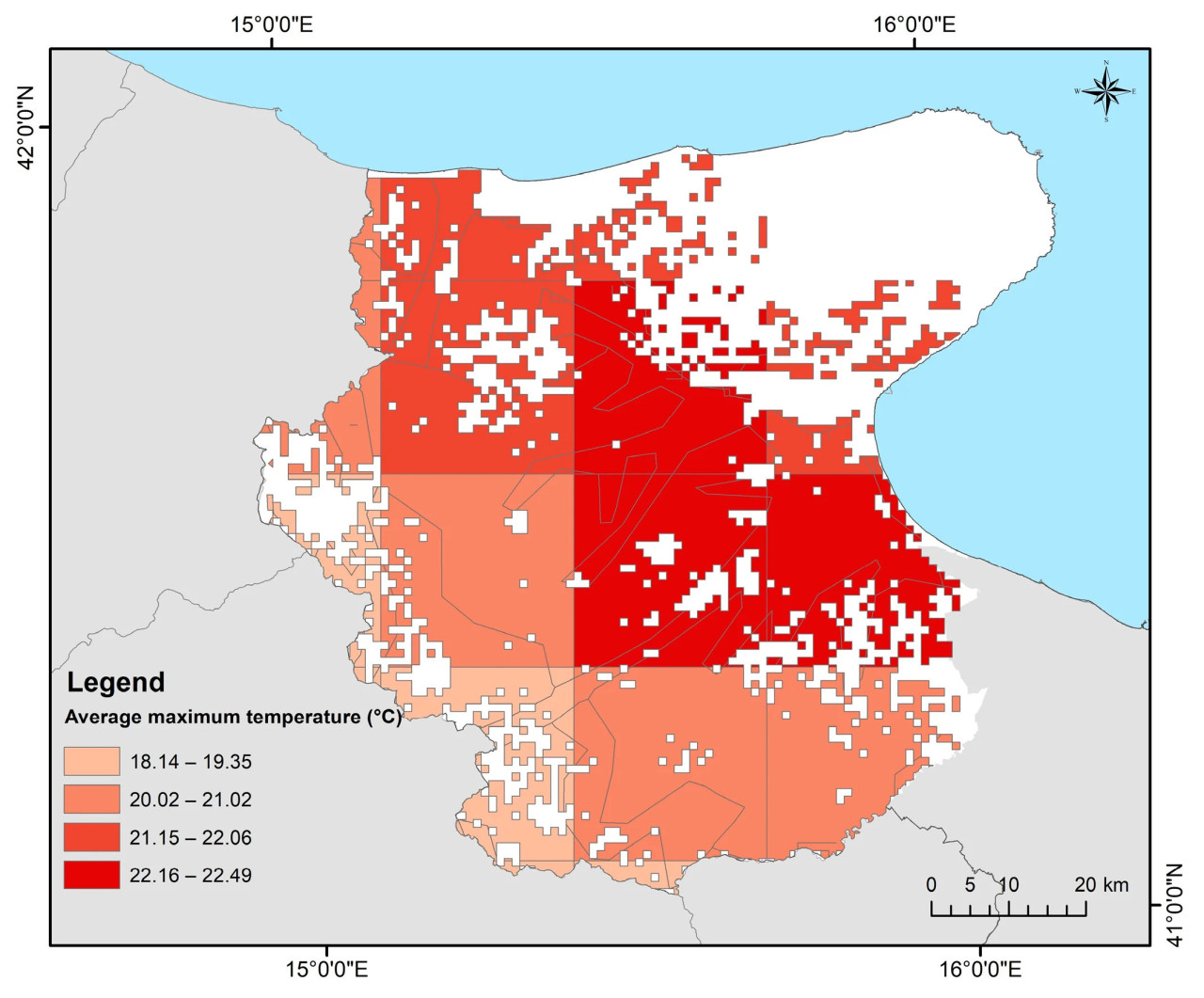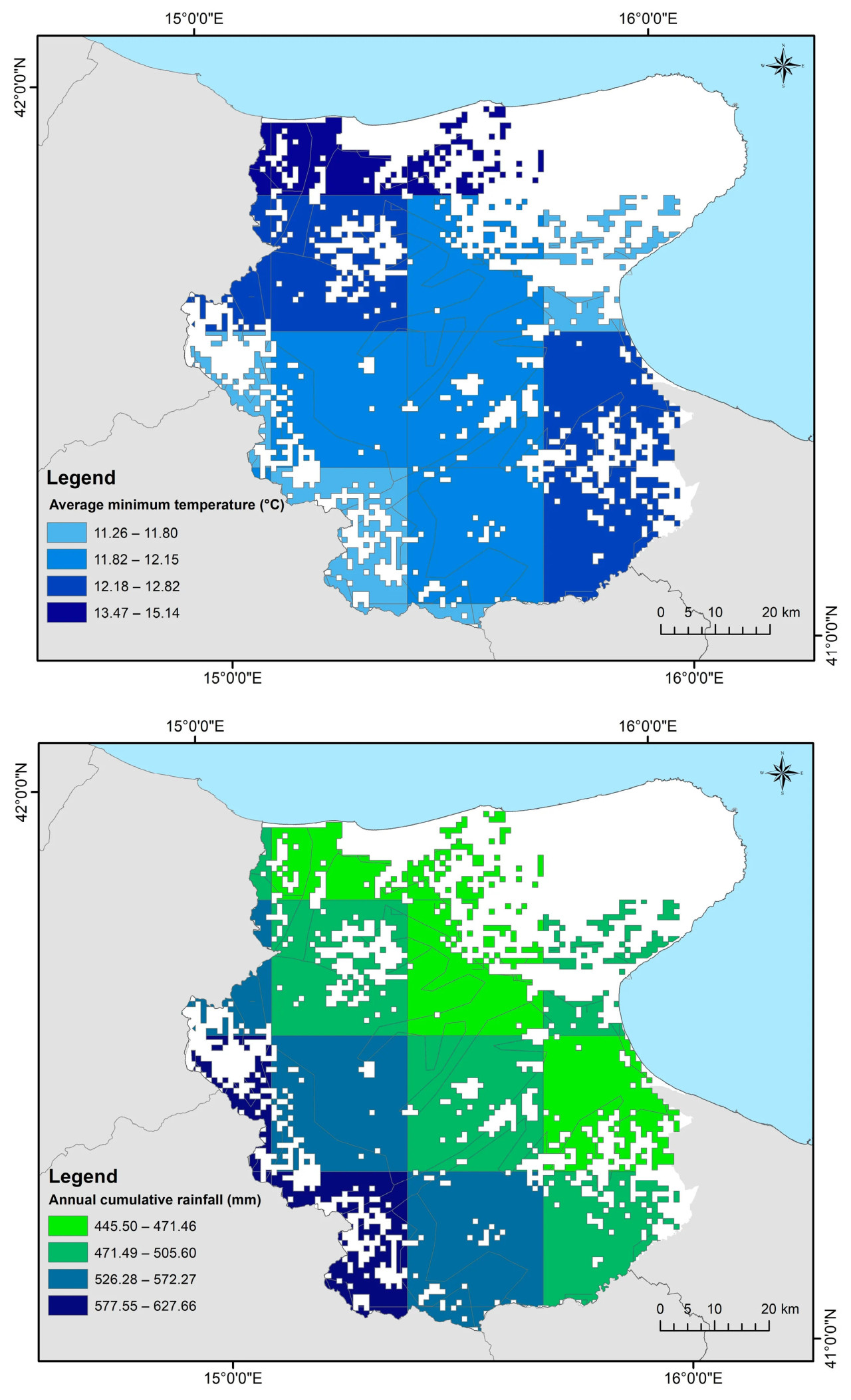 Что касается годовых термических данных (среднегодовые температуры за период 2010–2023 гг.), то центральная (равнинная) область и часть северной области испытали самые высокие максимальные температуры (около 22 °C) по сравнению с внутренними холмистыми районами с различиями от +2 °C до +4 °C (Рисунок 3). Северная часть региона показала самые высокие минимальные температуры по сравнению с остальной частью анализируемой климатической зоны со среднегодовыми значениями до 15 °C, т.е. до 4 °C выше, чем в более холодных районах в крайней западной части (Рисунок 3).