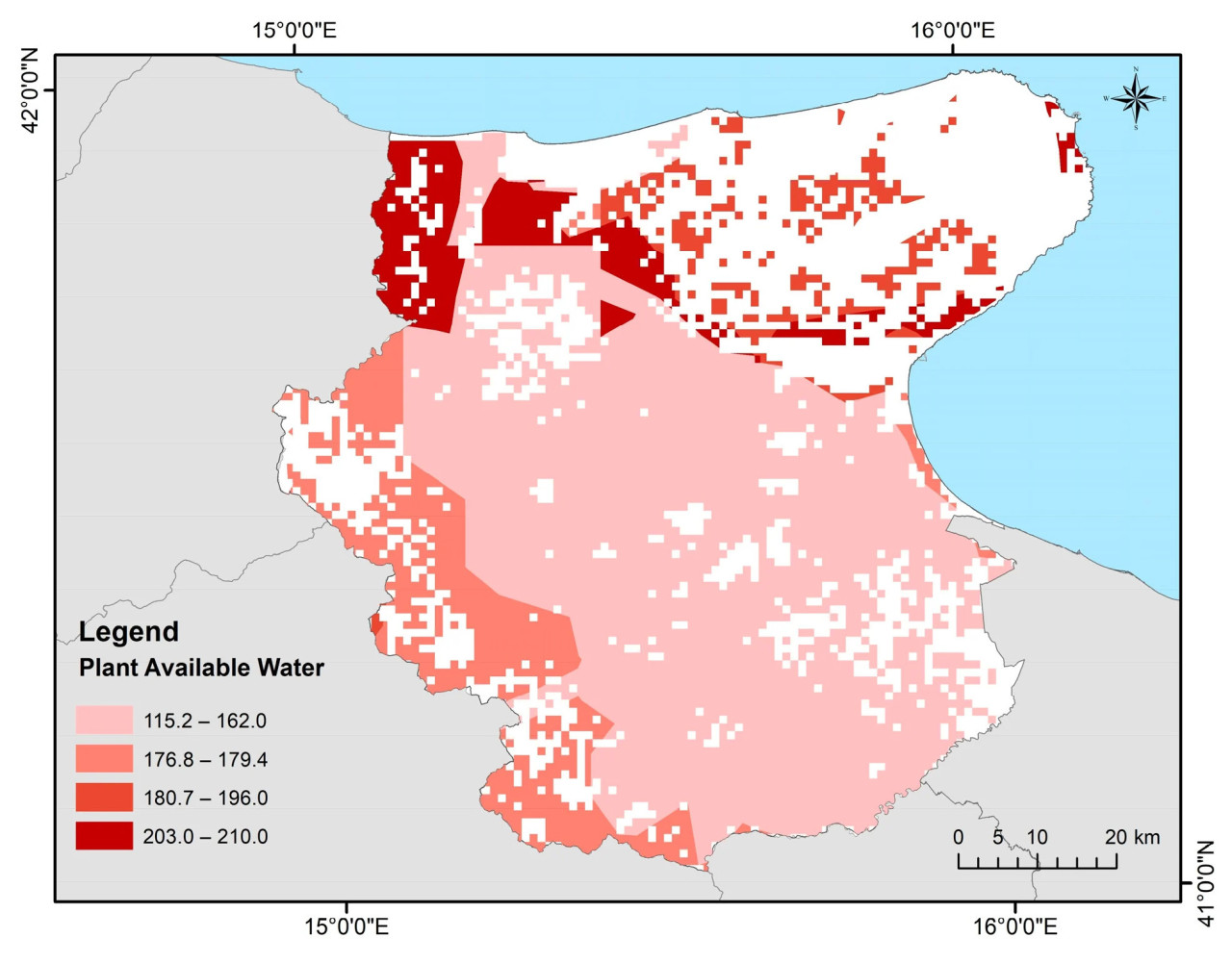 Рисунок 4. Доступная для растений вода (PAW, мм) для почв равнины Капитаната. Эти характеристики получены из текстуры и глубины почв в этом районе возделывания твердой пшеницы [60].