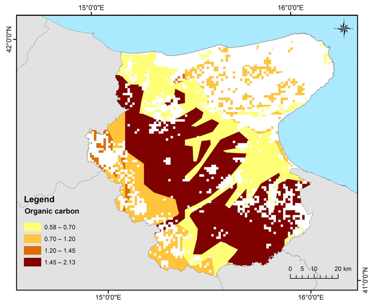 Зарегистрированные различия для этой климатической переменной достигли пиков около 180 мм, что соответствует увеличению на 17% между самыми дождливыми районами в холмистой зоне по сравнению с центральной зоной и до 33% при сравнении самой западной области с самой восточной. Доступная для растений вода (Plant Available Water, PAW; Рисунок 4) варьируется от минимума 15 мм до максимума 210 мм. Большая часть территории имеет почвы с доступностью воды для растений от 115 до 163 мм, сосредоточенные в центральной области территории с более высокими значениями PAW, граничащими с западной областью (до 196 мм) и севером территории (до 210 мм). Следует отметить, что AquaCrop-GIS использует этот параметр, наряду с глубиной, для характеристики почв, что необходимо для формализации динамики почвенной влаги. Процент почвенного органического углерода (OC, %; Рисунок 5) был выше в центральной полосе района возделывания (с севера на юг) со значениями от 1,45% до 2,13%. Районы, окружающие эту центральную полосу, характеризовались более низкими уровнями органического углерода с процентами от 0,70 до 1,45% в холмистой области на западе и минимумом 0,58–0,70% в самой восточной зоне территории.
