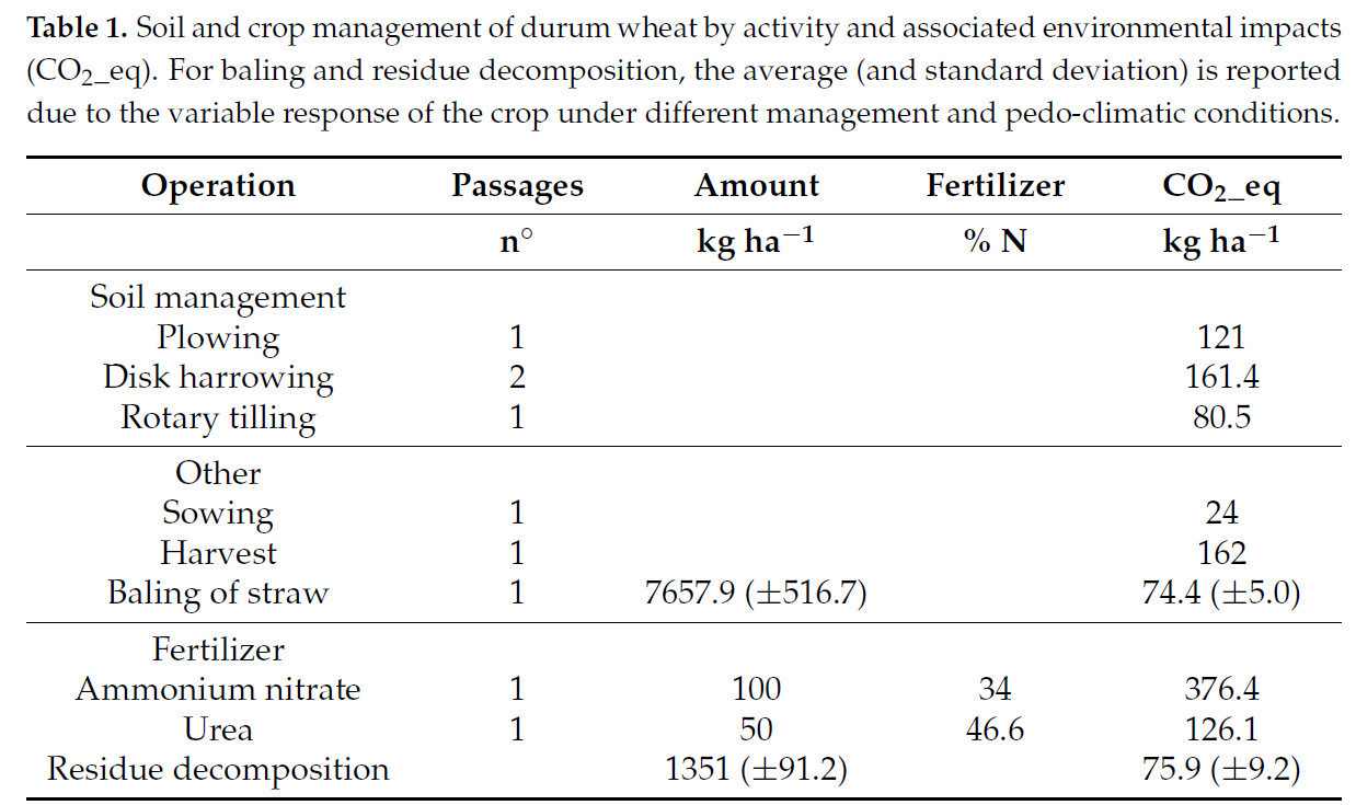 Таблица 1. Управление почвой и культурами для твердой пшеницы по видам деятельности и связанные с ними воздействия на окружающую среду (CO₂-экв.). Для тюкования и разложения остатков указано среднее значение (и стандартное отклонение) из-за переменной реакции культуры при различных условиях управления и педо-климатических условиях.