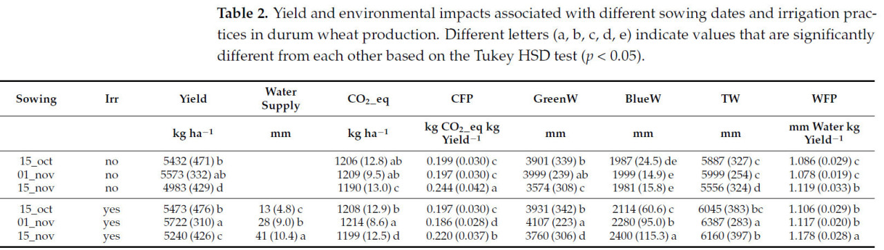 Таблица 2. Урожайность и воздействие на окружающую среду, связанные с различными сроками посева и практиками орошения при производстве твердой пшеницы. Разные буквы (a, b, c, d, e) указывают на значения, которые значительно отличаются друг от друга на основе теста Тьюки HSD (p < 0,05).