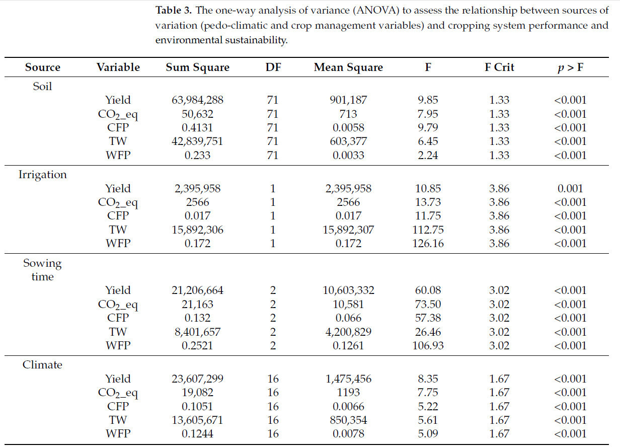 Однофакторный дисперсионный анализ (ANOVA) использовался для определения того, зависит ли и в какой степени изменчивость продуктивности и экологической эффективности сельскохозяйственной системы от педо-климатического контекста, управления орошением и даты посева. Для этого анализа источниками вариации были климатические зоны, типы почв, три даты посева и использование или неиспользование оросительной воды. ANOVA показал, что каждый источник вариации, рассматриваемый индивидуально, был высоко значимым в модулировании продуктивности твердой пшеницы, выбросов ПГ, водопользования и, наконец, CFP и WFP (p < 0,001; Таблица 3).