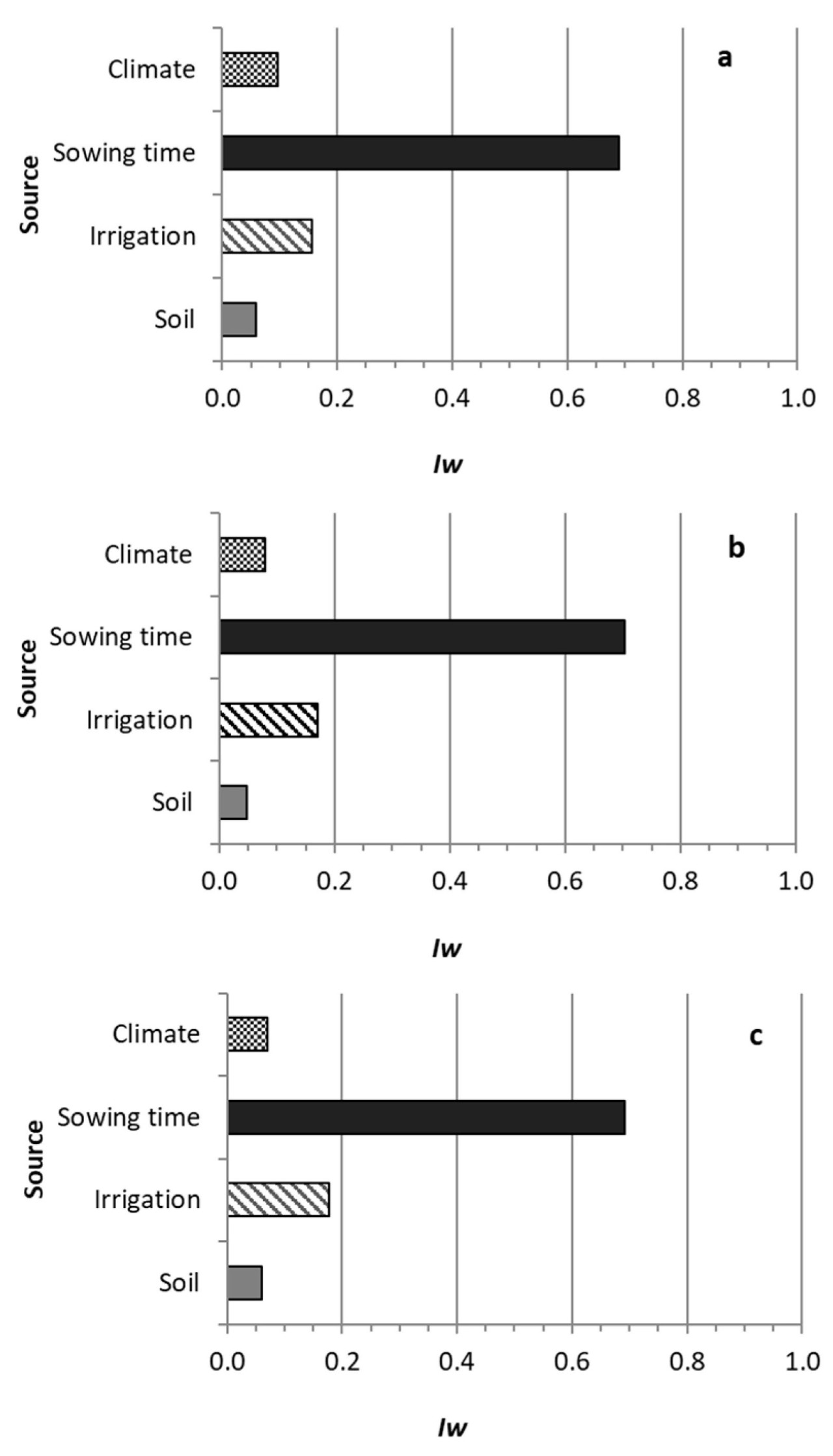 Однако полученные результаты не позволили провести всестороннюю оценку влияния каждого источника вариации относительно других на анализируемые переменные. Чтобы ранжировать влияние климата, почвы, даты посева и использования оросительной воды в глобальном масштабе, был проведен анализ чувствительности (Уравнение (14)) для отображения эффектов (Iw) по шкале от 0 (нет эффекта) до 1 (максимальный эффект). Для продуктивности культуры (Рисунок 6a) дата посева стала фактором, наиболее ответственным за изменчивость этого параметра (Iw = 0,69), за которым следовало управление орошением (Iw = 0,16), а затем почва и климат. Та же тенденция наблюдалась для выбросов ПГ (Рисунок 6b), где CO₂-экв., генерируемый сельскохозяйственной системой, в значительной степени зависел от трех дат посева, за которыми следовало использование или неиспользование оросительной воды, а затем педо-климатический контекст. Поскольку CFP тесно связан с урожайностью и CO₂-экв., было обнаружено, что и для этого параметра дата посева оказала наибольшее влияние на экологическую устойчивость, выраженную этим индексом (Рисунок 6c). Напротив предыдущим наблюдениям, для общего водопотребления (TW) управление орошением имело наибольший вес в модулировании водопотребления сельскохозяйственной системы (Iw = 0,74, Рисунок 7a), за ним следовала дата посева (Iw = 0,19) и, в меньшей степени, климат и почва. Связывая TW с произведенным зерном (Рисунок 7b), было подтверждено, что этот параметр был наиболее чувствителен к управлению орошением (Iw = 0,56), при этом дата посева (Iw = 0,41) находилась недалеко позади, в то время как климат и почва оставались ниже в рейтинге.