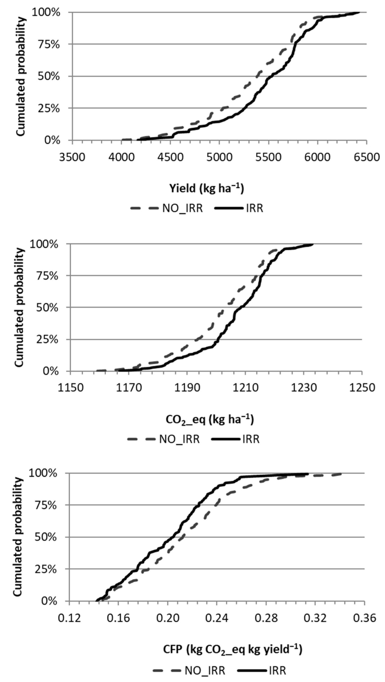 Рисунок 8. Функция кумулятивного распределения относительно урожайности зерна, выбросов ПГ (CO₂-экв.) и углеродного следа (CFP) для системы возделывания твердой пшеницы при богарном и орошаемом (в фазу цветения) управлении.