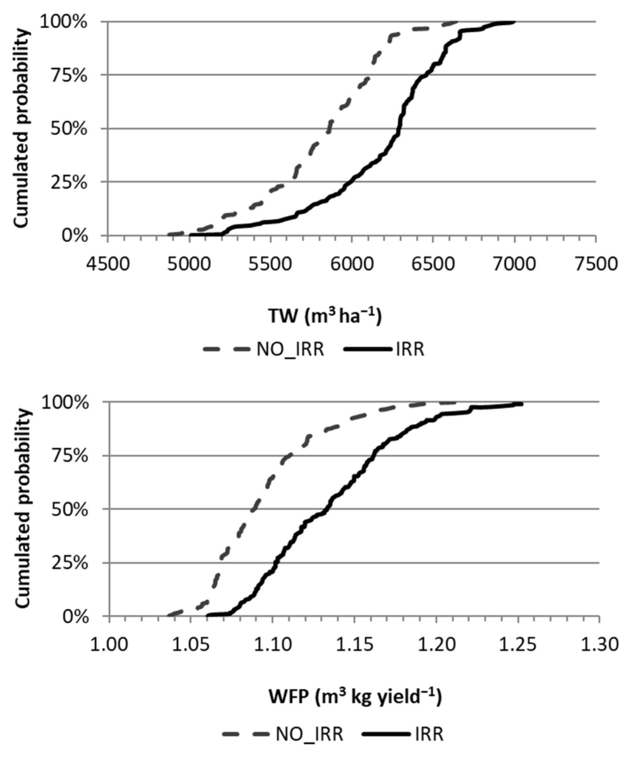 Рисунок 9. Функция кумулятивного распределения относительно общего потребления воды (TW) и водного следа (WFP) для системы возделывания твердой пшеницы при богарном и орошаемом (в фазу цветения) управлении.
