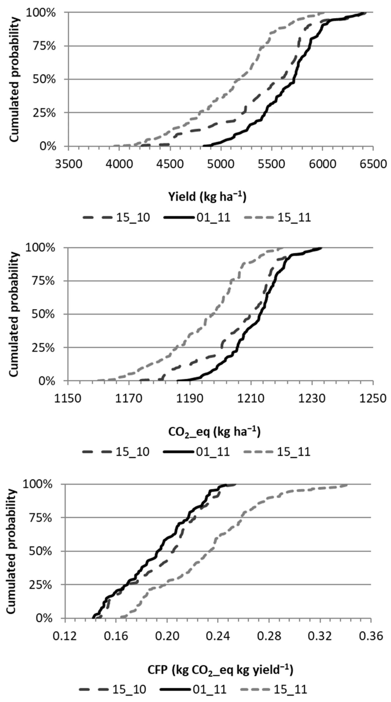 Рисунок 10. Функция кумулятивного распределения относительно урожайности зерна, выбросов ПГ (CO₂-экв.) и углеродного следа (CFP) для системы возделывания твердой пшеницы, посеянной в середине октября (15_10), в начале ноября (01_11) и в середине ноября (15_11).