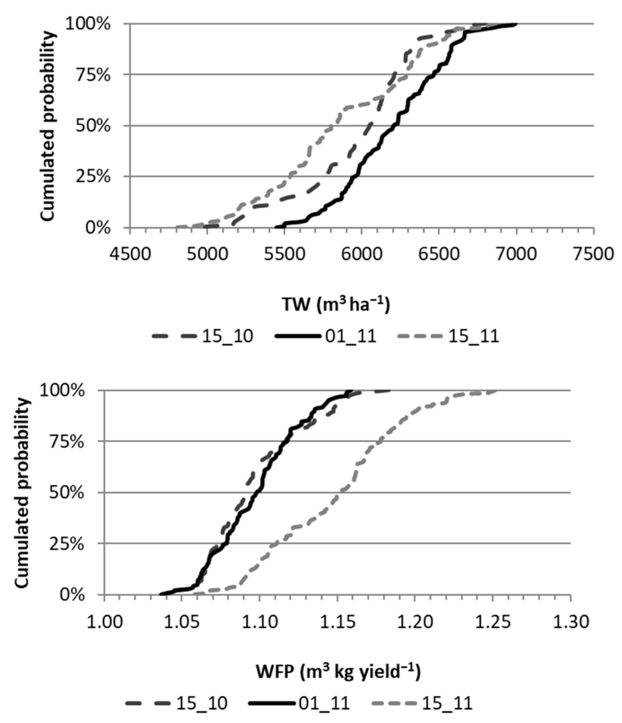 Рисунок 11. Функция кумулятивного распределения относительно общего потребления воды (TW) и водного следа (WFP) для системы возделывания твердой пшеницы, посеянной в середине октября (15_10), в начале ноября (01_11) и в середине ноября (15_11).