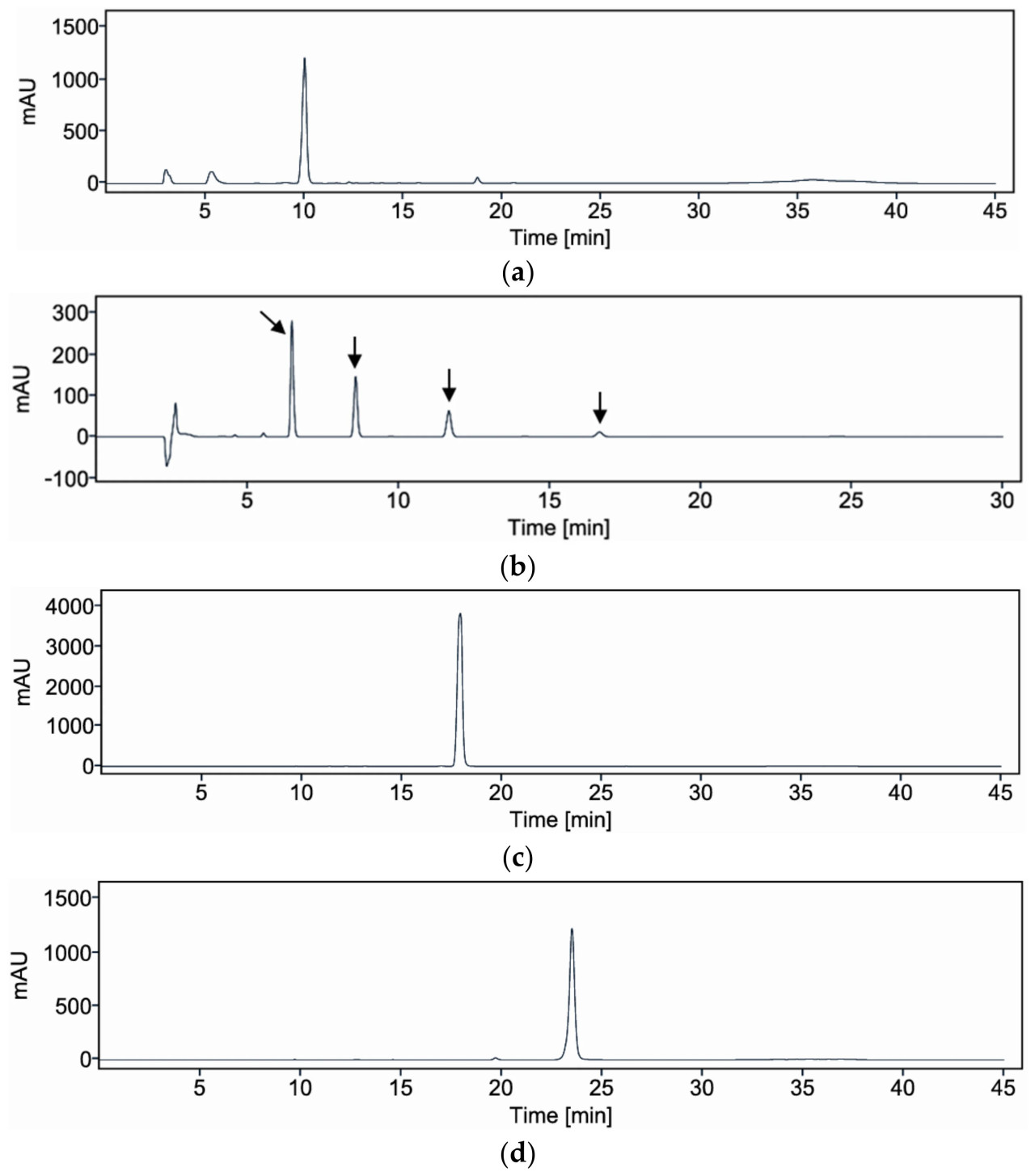 Рисунок 5. ВЭЖХ/УФ хроматограммы аллиина (a), аллицина (DAS, 6,5 мин; DAT, 8,6 мин; DADS, 11,7 мин; DATS, 16,6 мин) (b), тиамина (c) и аллитиамина (d).