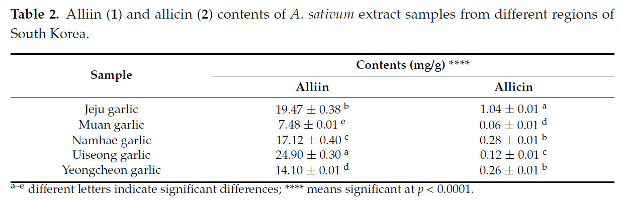 Образцы чеснока были собраны из различных регионов Южной Кореи и проанализированы для выявления тех, которые имеют самое высокое содержание аллицина, чтобы максимизировать потенциал чеснока как функционального ингредиента путем отбора образцов, богатых серосодержащими биоактивными соединениями. Содержание аллиина и аллицина в этих образцах чеснока значительно различалось (Таблица 2 и Рисунок 6).