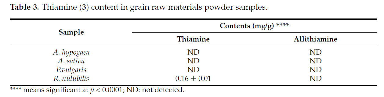 Тиамин и аллитиамин были сначала проанализированы в чесноке и зерновых по отдельности. Результат показал, что тиамин присутствует только в следовых количествах в зерновых, тогда как его содержание в чесноке Чеджудо составляло всего 0,97 мг/г (Таблица 4). С другой стороны, аллитиамин не был обнаружен во всех зерновых и только в следовых количествах в образце чеснока Чеджудо. Из-за этих результатов экстракт чеснока был смешан с зерновыми для изучения эффектов зерновых при сочетании с чесноком в синтезе аллитиамина.