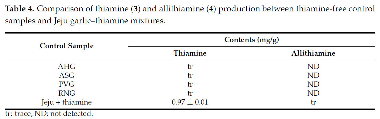 Таблица 4. Сравнение продукции тиамина (3) и аллитиамина (4) между контрольными образцами без тиамина и смесями чеснока Чеджудо с тиамином.