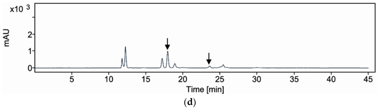 Обращенно-фазовый ВЭЖХ-анализ проводился на системе Agilent 1260 Infinity II, оснащенной Quat Pump и УФ-детектором, с использованием колонки Aegispak C18-L (3,0 × 150 мм, 5 мкм) при 30 °C. Объем инъекции образца составлял 10 мкл. Подвижная фаза состояла из 20 мМ одноосновного дигидрофосфата натрия и 10 мМ натриевой соли 1-гептансульфоновой кислоты в воде, с доведением pH до 2,2 с помощью фосфорной кислоты в качестве растворителя A и смеси ACN и растворителя A (50:50) в качестве растворителя B для аллиина и MeOH в качестве растворителя B для тиамина и аллитиамина. Скорость потока была установлена на 0,3 мл/мин. Длина волны детектирования составляла 208 нм для аллиина и 254 нм для тиамина и аллитиамина (Рисунок 5). Градиент подвижной фазы был запрограммирован следующим образом: 0% B при 0 мин, 30% B при 5 мин, 54% B при 25 мин и 100% B с 30 по 32 мин, с последующей повторной уравновешиванием при 100% A с 37 по 45 мин. Следуя предыдущим сообщениям, анализ проводился в этих условиях для обеспечения полного разделения и детектирования целевых соединений [25,26].
