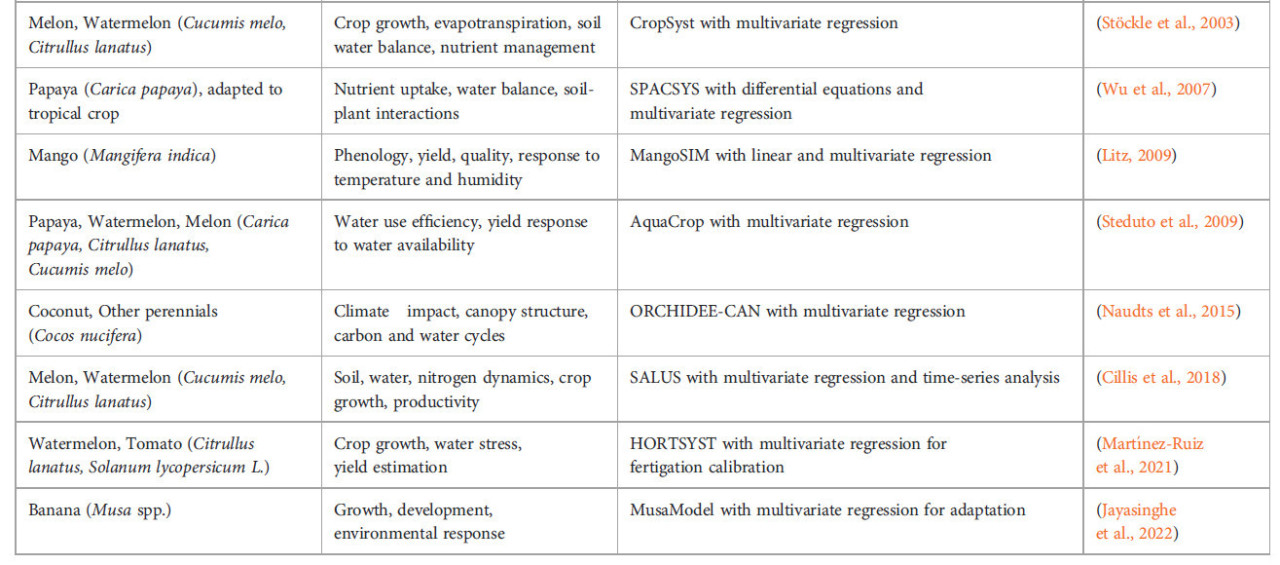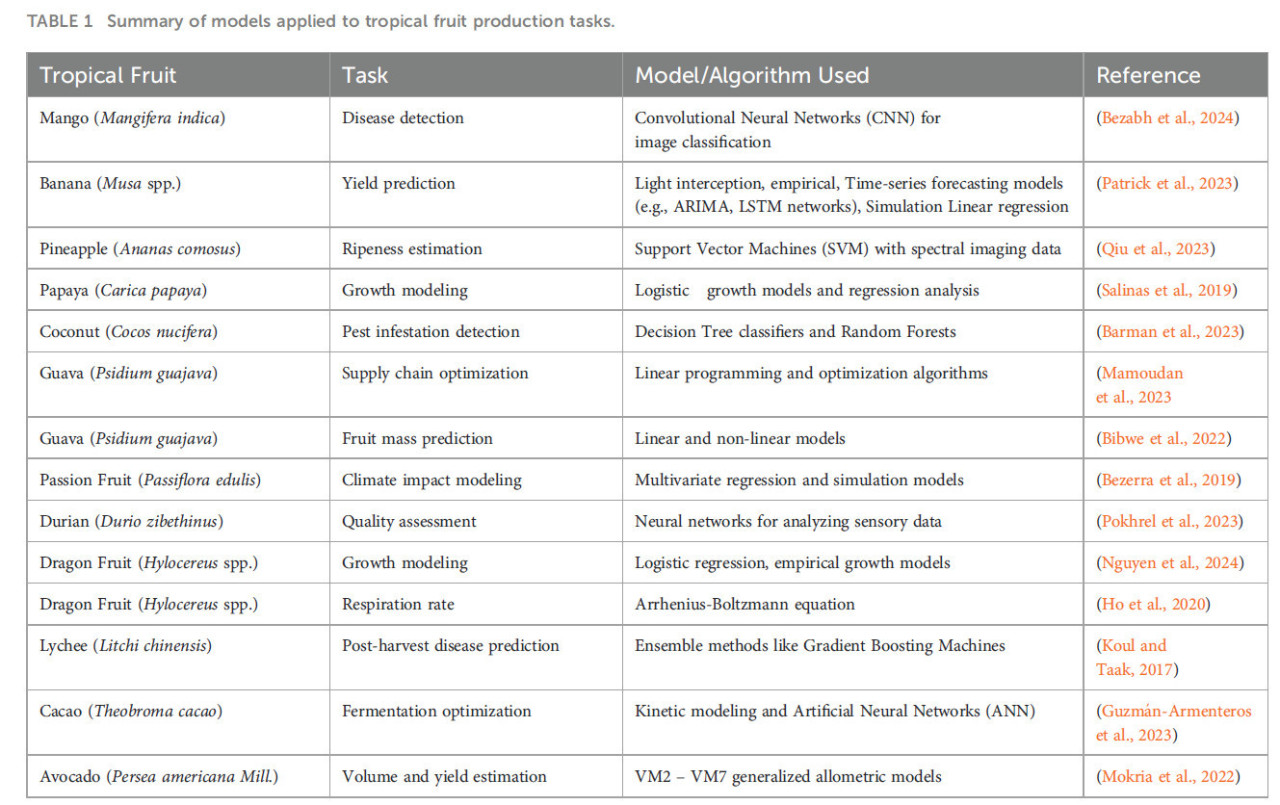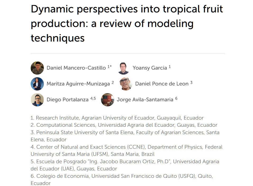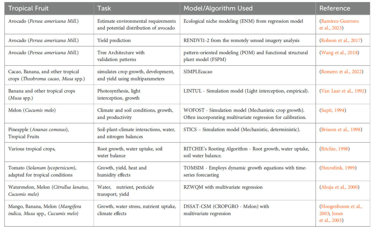 Mancero-Castillo D, Garcia Y, Aguirre-Munizaga M, Ponce de Leon D, Portalanza D and Avila-Santamaria J (2024) Dynamic perspectives into tropical fruit production: a review of modeling techniques. Front. Agron. 6:1482893. doi: 10.3389/fagro.2024.1482893