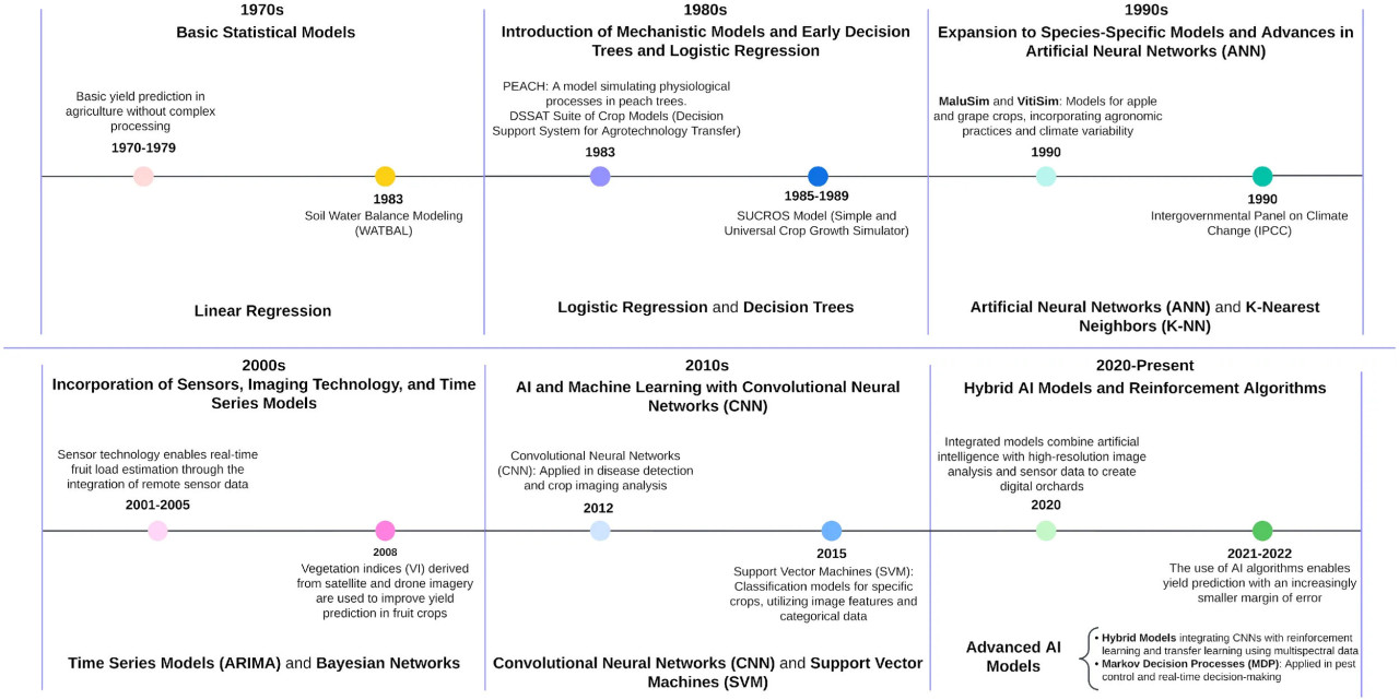 Использование моделей и алгоритмов для производства фруктов является тенденцией для улучшения производства фруктов посредством анализа данных (Mathiazhagan и др., 2021). Некоторые из наиболее распространенных используемых алгоритмов связаны с прогнозированием урожайности фруктов, точным земледелием, обнаружением вредителей и болезней фруктов, селекцией и генетикой фруктов, управлением отходами производства фруктов и анализом рынка. Пионерские модели для многолетних культур начали появляться в 1980-х годах с TREEDYN (Bossel, 1996), еще до появления персональных компьютеров, и с тех пор эволюционировали в гибридные модели ИИ на облачных платформах. Временная эволюция моделирования на Рисунке 2 выделяет ключевые достижения, связанные с моделированием фруктов, начиная с базовых статистических моделей, переходя к механистическим моделям, искусственным нейронным сетям и интеграции датчиков, и заканчивая современными приложениями ИИ и машинного обучения, такими как сверточные нейронные сети и гибридные модели ИИ. Каждое десятилетие отмечено значительными разработками, детализирующими конкретные модели и технологии, способствующие прогнозированию урожайности, обнаружению болезней и оптимизации ресурсов в моделировании плодовых деревьев.