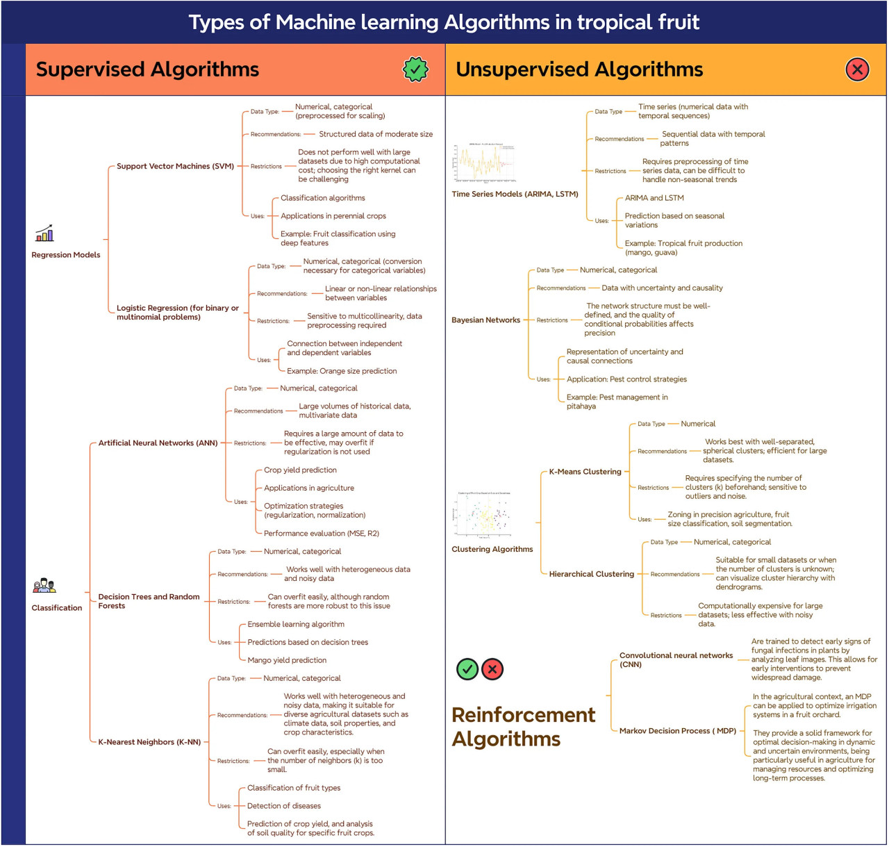 В этом исследовании подчеркиваются неотъемлемые проблемы моделирования тропических фруктов, такие как циклы плодовых деревьев, дорогостоящие и трудоемкие эксперименты, а также отсутствие стандартизированных данных. Эти ограничения очевидны для тропических фруктов, где было описано или валидировано лишь несколько моделей для какао, авокадо, дуриана, питайи, банана, манго или маракуйи. В данном исследовании анализируется классификация алгоритмов, связанных с тропическими фруктами, на три основные категории: обучение с учителем, без учителя и с подкреплением, каждая из которых имеет конкретные приложения для оптимизации управления сельским хозяйством.