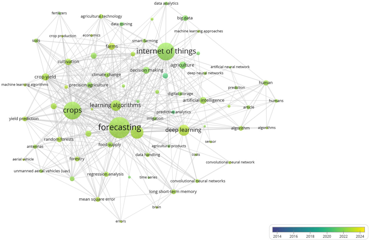 Рисунок 4 Анализ ключевых слов и силы ассоциации в исследовательской литературе, связанной с моделированием тропических фруктов. Градиент цвета указывает на время с 2014 (синий) по 2024 (желтый) год.