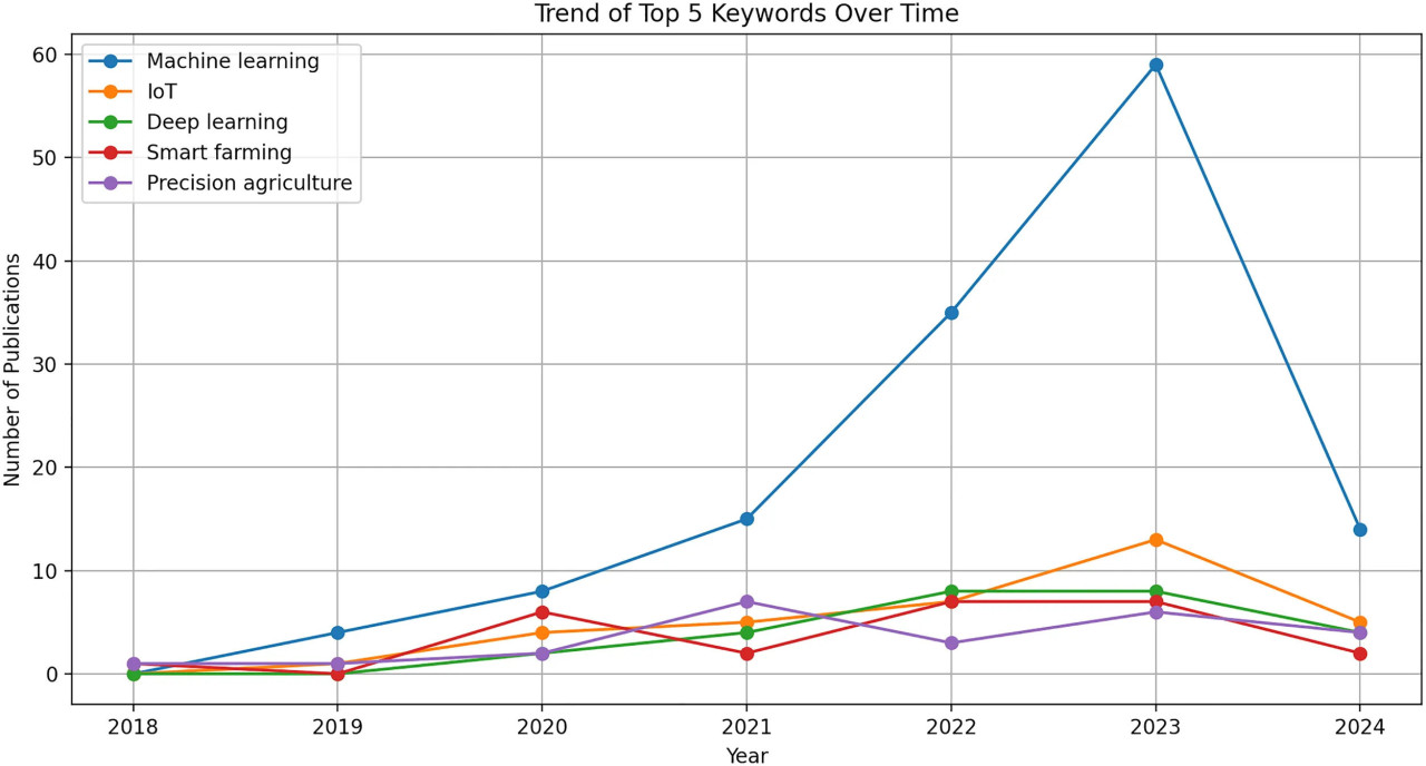 Рисунок 5 Ежегодный уровень публикации научных статей, индексированных в Scopus, по темам машинного обучения, IoT, глубокого обучения, умного фермерства и точного земледелия, связанным с производством фруктов, с 2018 по 2024 год.