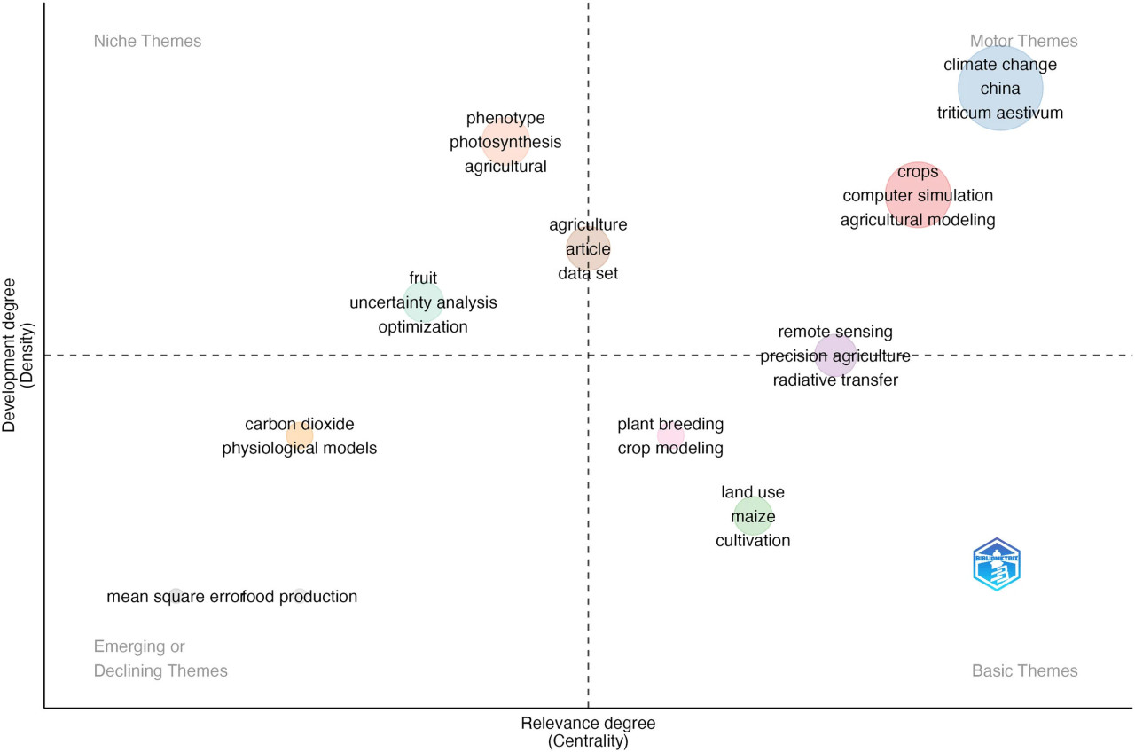 Анализ тематической карты (Рисунок 6) подчеркивает значительную междисциплинарную интеграцию традиционных сельскохозяйственных методов с передовыми вычислительными моделями в исследовательской среде. Термин «культуры» становится центральной темой с 11 встречами и высоким показателем промежуточной центральности 7175,77, что подчеркивает его ключевую роль в соединении различных тем исследований. Эта центральность предполагает, что дискуссии вокруг «культур» служат фундаментальным элементом, эффективно связывая практические сельскохозяйственные проблемы с теоретическими подходами к моделированию.