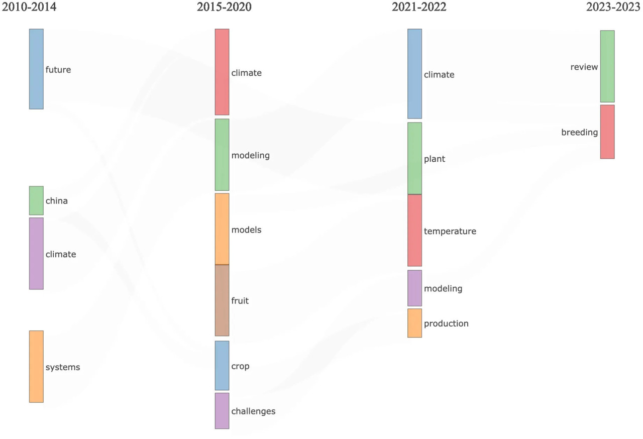 Анализ тематической эволюции, как показано на Рисунке 7, иллюстрирует динамические сдвиги в фокусе исследований в области производства тропических фруктов с течением времени, охватывая период с 2010 по 2023 год. Начальный период 2010-2014 годов был в основном сосредоточен на таких темах, как «будущее» и «китай», с взвешенным индексом включения (WII) 0,20 для переходов, например «китай–2010-2014» в «климат–2015-2020». Этот сдвиг подчеркивает растущий акцент на проблемах, связанных с климатом, в китайском контексте. WII 0,20, хотя и умеренный, подчеркивает растущую важность климатических соображений в этот период.