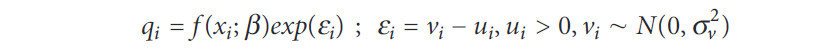 где qi представляет уровень выпуска, f(xi; β) — детерминированная часть модели с входными данными xi и коэффициентами β, а exp(εi) — экспоненциальная функция составной ошибки с ошибкой шума (vi) и ошибкой неэффективности (ui). Производственная граница задается как f(xi; β) exp(vi), а мера неэффективности — ui. Здесь исследователь должен предположить распределение для εi, например, полунормальное, экспоненциальное, усеченное нормальное, гамма и т.д. Стратегия максимального правдоподобия (ML) оценивает эту модель, используя ее асимптотические свойства, а оценки для показателей неэффективности получаются из условного распределения ui при заданном оцененном εi (Greene, 2008; Belotti и др., 2013).