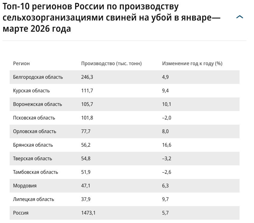 В январе—марте 2026 года сельхозорганизации России произвели 1,47 млн тонн свиней в живом весе на убой, следует из данных Росстата. Год к году значение выросло на 5,7%. Увеличение объемов показали почти все ключевые регионы. Например, в Белгородской области производство свинины прибавило 4,9% год к году, до 246,3 тыс. тонн, в Курской — 9,4%, до 111,7 тыс. тонн. В Минсельхозе интенсивный рост в свиноводстве связывают с притоком инвестиций.