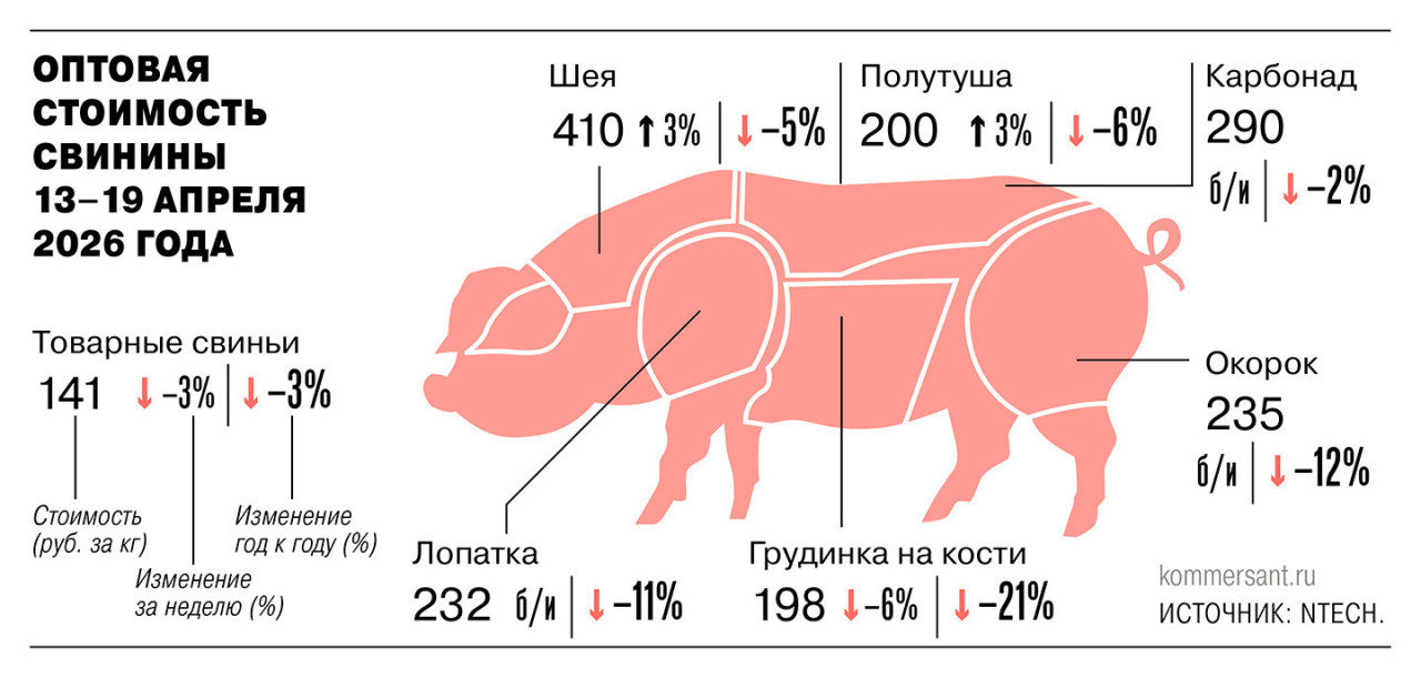 Свиноводы в условиях увеличения производства и насыщения рынка сталкиваются со снижением цен на свою продукцию. Согласно NTech, на неделе 13–19 апреля оптовая стоимость товарных свиней составила 141 руб. за 1 кг, потеряв 3% год к году. Самым подешевевшим отрубом стала грудинка на кости, потеряв 21% год к году, до 198 руб. за 1 кг. В Минсельхозе среднюю стоимость свинины в полутушах на 15 апреля оценивают в 193,2 руб. за 1 кг. Год к году значение сократилось на 0,9%. Рынок чувствителен к избытку предложения, констатирует Дмитрий Краснов.