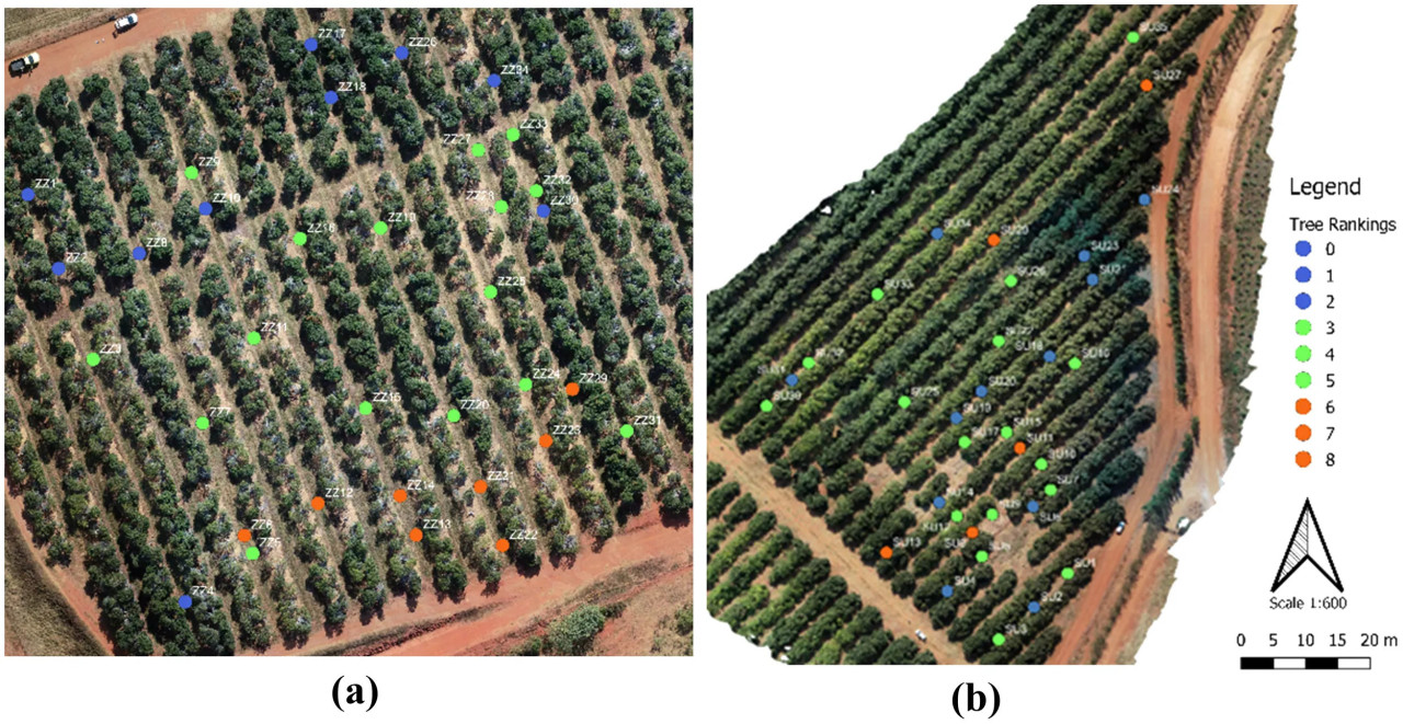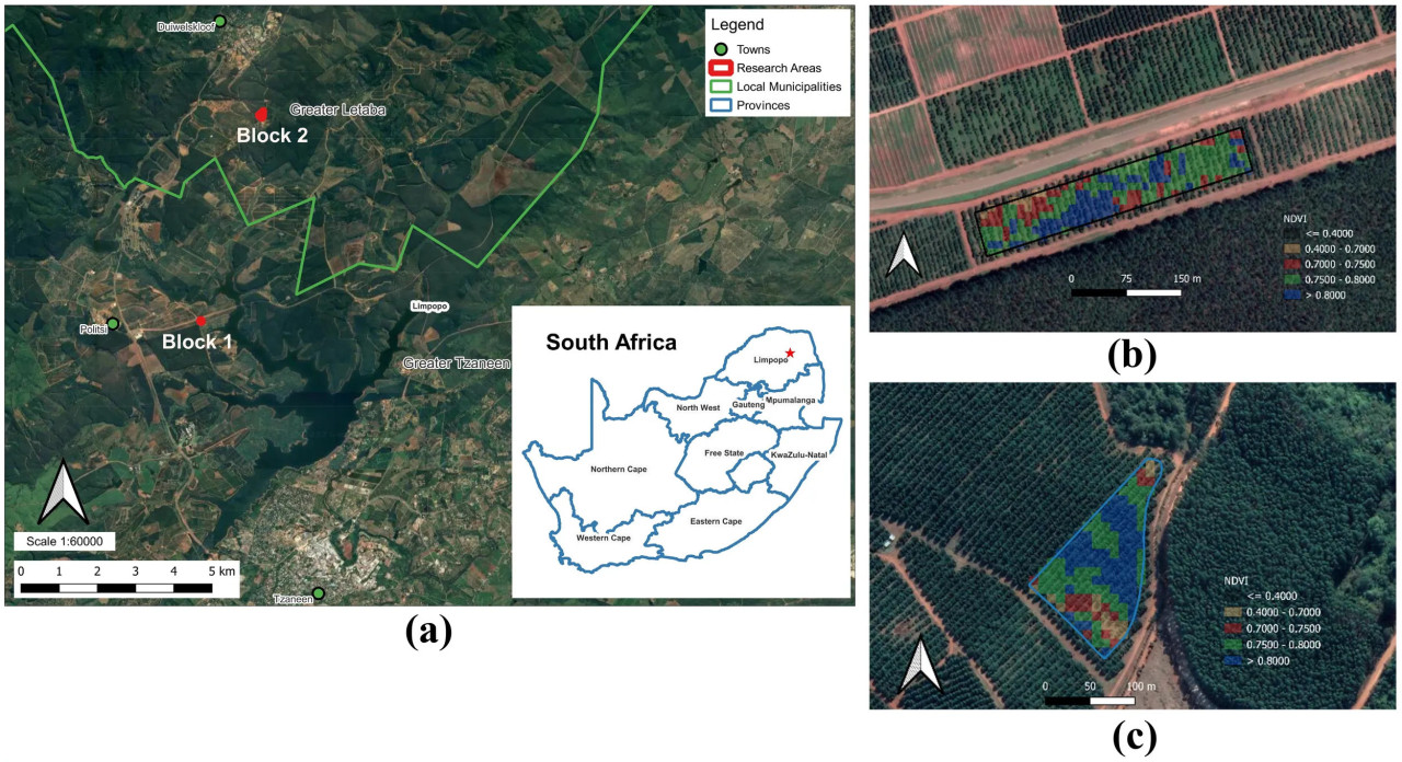 Были выбраны исследовательские блоки, содержащие от 13 до 17 рядов деревьев площадью ±1,18 гектара (га) для блока, управляемого ZZ2 (блок 1), и ±1,85 га для блока, управляемого Westfalia Fruit (блок 2). Целевые деревья были отобраны двумя опытными специалистами из ZZ2 и Westfalia Fruit, полагаясь на визуальные оценки с использованием шкалы ранжирования «Ciba-Geigy». Для этого исследования было отобрано в общей сложности 69 деревьев: 34 дерева в блоке 1 и 35 деревьев в блоке 2. Чтобы обеспечить наличие изменчивости в наборе данных о деревьях, были отобраны целевые деревья, проявляющие разную степень ухудшения состояния кроны, с безразмерными значениями от 0 до 8. Кроме того, местоположения целевых деревьев были зафиксированы с помощью GPS-ровера, и их координаты были сохранены в системе отсчета WGS-84. Положения деревьев измерялись в середине рядов, перпендикулярно деревьям. Точность этих положений имеет первостепенное значение из-за мультивременного аспекта этого исследования и необходимости точной интеграции по используемым методам ДЗ.