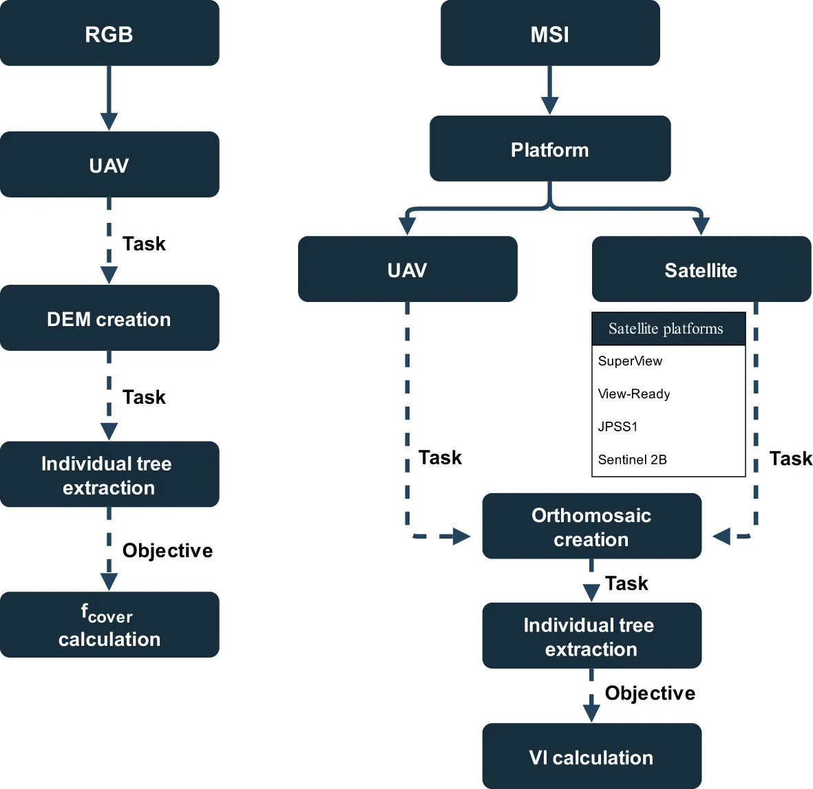 Что касается деревьев авокадо, предыдущие исследования не учитывали состояние кроны и влияние управления садом. Эти исследования в основном сосредоточены на отдельных садах с краткосрочными или без временных аспектов для обнаружения болезней или оценки состояния кроны на уровне сада или фермы. Кроме того, хотя несколько платформ (т.е. одна платформа или проксимальная в сочетании со спутниковыми снимками) были исследованы на других культурах, комбинированное использование снимков БПЛА и спутников остается неизученным на авокадо.