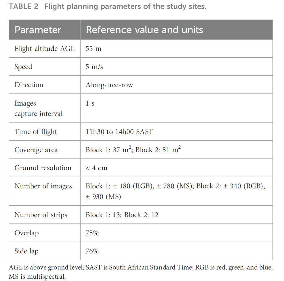 Изображения обоих блоков были получены в каждый из четырех периодов сбора данных с использованием мультиротора DJI Phantom 4 Pro (DJI, Шэньчжэнь, Китай). Мультиротор был оснащен 16-битной RGB-камерой (модель FC6310) и 12-битной мультиспектральной камерой RedEdge™ 3 (MicaSense Inc., Сиэтл, США). Камера RedEdge™ 3 регистрировала спектральную информацию в синем [B] (465 – 475 нм); зеленом [G] (550 – 570 нм); красном [R] (663 – 673 нм); красном ребре [RE] (716 – 722 нм) и ближнем инфракрасном [NIR] (820 – 860 нм) диапазонах. Обе камеры были стабилизированы по тангажу, крену и рысканию трехосным подвесом. Чтобы обеспечить полное покрытие площадей, БПЛА управлялся автономно по предварительно запрограммированным траекториям полета с параметрами, показанными в Таблице 2, установленными в приложении DroneDeploy (Калифорния, США). Полеты проводились как можно ближе к солнечному полудню, чтобы избежать теней, и БПЛА летел по траектории полета вдоль рядов деревьев.