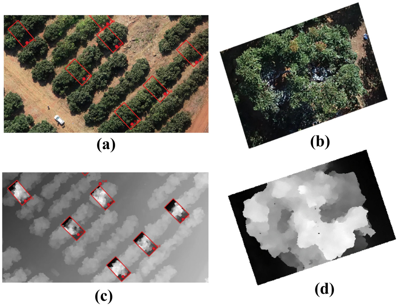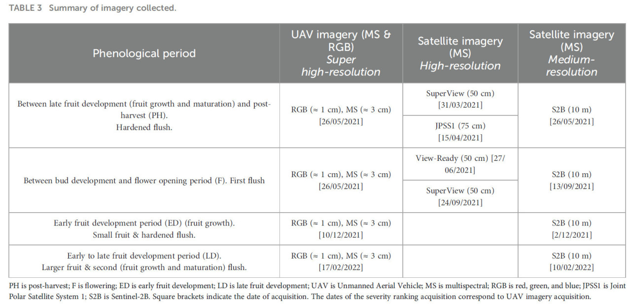 RGB и мультиспектральные (MS) изображения, полученные с аэральных платформ с разным разрешением, показали свою эффективность в обнаружении различных симптомов болезней и состояния здоровья на нескольких плодовых культурах на уровне сада или фермы. Примеры включают банановые растения (Selvaraj et al., 2020), макадамию (Johansen et al., 2020), оливки (Hornero et al., 2020), авокадо (De Castro et al., 2015; Salgadoe et al., 2018; Pérez-Bueno et al., 2019; Tu et al., 2019) и цитрусовые (Kumar et al., 2010; Li et al., 2012; Garcia-Ruiz et al., 2013; Chang et al., 2020; Garza et al., 2020). Однако большинство этих исследований были сосредоточены на фиксированных/одинаковых состояниях кроны в течение короткого/одного временного диапазона, часто пренебрегая фенологическими аспектами.