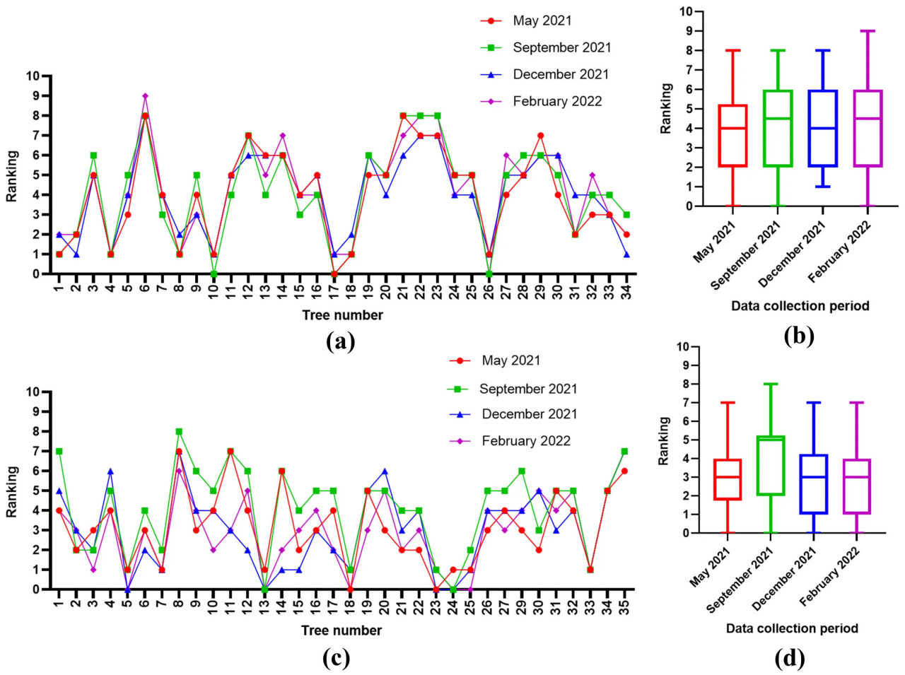 Рисунок 4 — Оценки степени тяжести целевых деревьев для каждого дерева в блоке 1 (A) и блоке 2 (C), и ящичковые диаграммы значений степени тяжести для каждого периода в блоке 1 (B) и блоке 2 (D).