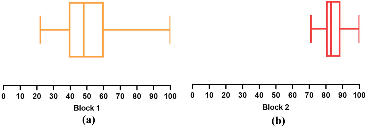 fcover было рассчитано для каждого целевого дерева в каждый период с использованием изображений БПЛА-RGB в процентах от определенного выбранного размера прямоугольника. Рисунок 5 показывает пример метода извлечения дерева, использованного для расчета fcover на основе высоты дерева. Рисунок 5A показывает RGB-изображение участка сада в блоке 2, а Рисунок 5B показывает RGB-изображение целевого дерева, для которого рассчитывается fcover. Рисунки 5C, D соответственно показывают DEM, где земля исключена с использованием метода порога высоты. fcover для блока 1 варьировалось от 22% до 100% с медианой 48% (Рисунок 6A). Стандартное отклонение составило 15%, что указывает на некоторую вариацию. В то время как fcover для блока 2 варьировалось от 71% до 100% с медианой 83%. Стандартное отклонение составило 6%, что указывает на небольшую вариацию (Рисунок 6B).