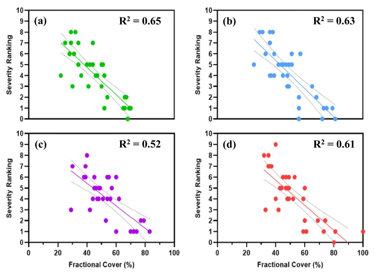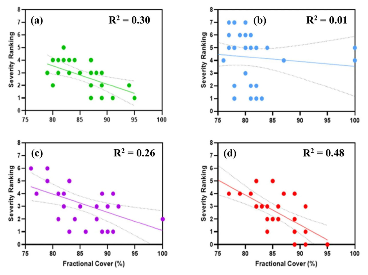 Рисунок 8 — Простая линейная регрессия между ранжированием степени тяжести и фракционным покрытием для блока 2. (A) Май 2021 г., (B) Сентябрь 2021 г., (C) Декабрь 2021 г. и (D) Февраль 2022 г.
