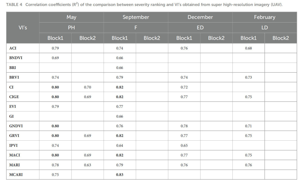 Таблица 4 — Коэффициенты корреляции (R²) сравнения между ранжированием степени тяжести и VI, полученными из изображений сверхвысокого разрешения (БПЛА).