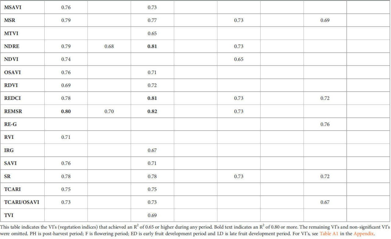 Эта таблица показывает VI (вегетационные индексы), которые достигли R² 0,65 или выше в любой период. Жирный текст указывает на R² 0,80 или более. Остальные VI и незначимые VI опущены. PH — послеуборочный период; F — период цветения; ED — период раннего развития плодов; LD — период позднего развития плодов. Для VI см. Таблицу A1 в Приложении.
