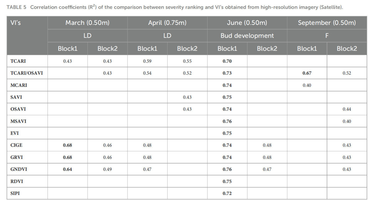 Помимо снимков с разрешением 0,50 м, полученных в июне, и трех индексов с высокой корреляцией из мартовских снимков, значения VI для обоих блоков были относительно сходными. Это предполагает, что эффект управления кроной с помощью этой методики не так очевиден, как с помощью методики БПЛА. Это связано с тем, что разрешение слишком низкое, и невозможно различить более мелкие детали кроны. Из этой части нашего исследования мы можем предположить, что CIGE, GRVI, GNDVI, MSAVI и OSAVI следует дополнительно исследовать при обнаружении PRR, поскольку они показали перспективность в периоды LD и развития почек.